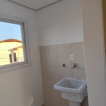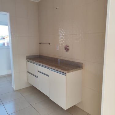 Áreas de Convivência: Cozinha com armários da pia, sala de estar e jantar e lavanderia.